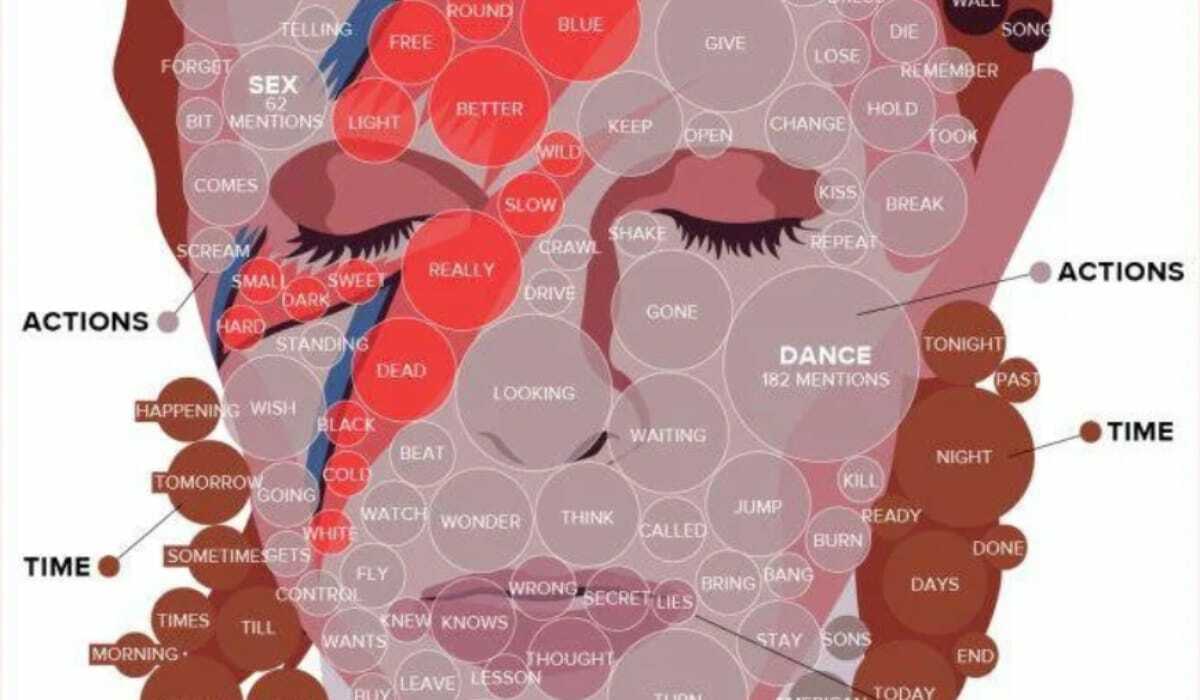 Take for example the Anatomy of Bowie's Lyrics by AZLyrics.com shown above. We're not focused on the data extrapolation but rather on the effectiveness of presentation.