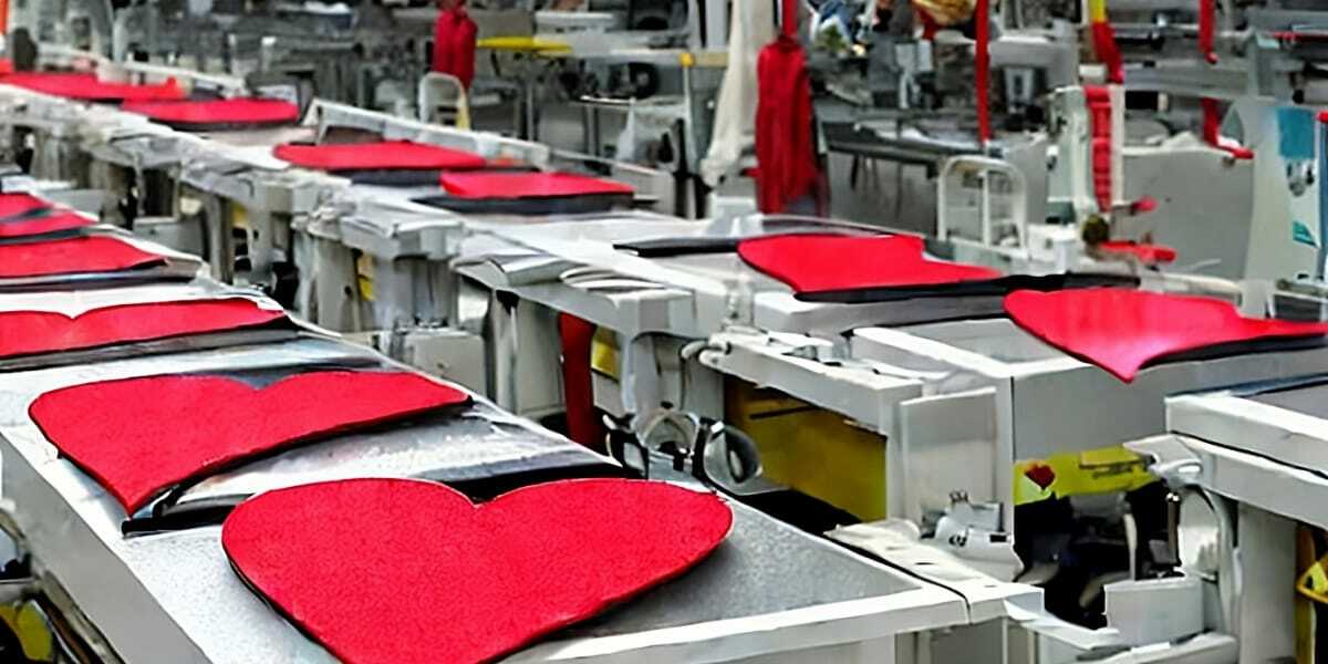 An automated assembly line of T-Shirts with hearts on them in the style of Disney | Hugging Face by Stable Diffusion 2.1